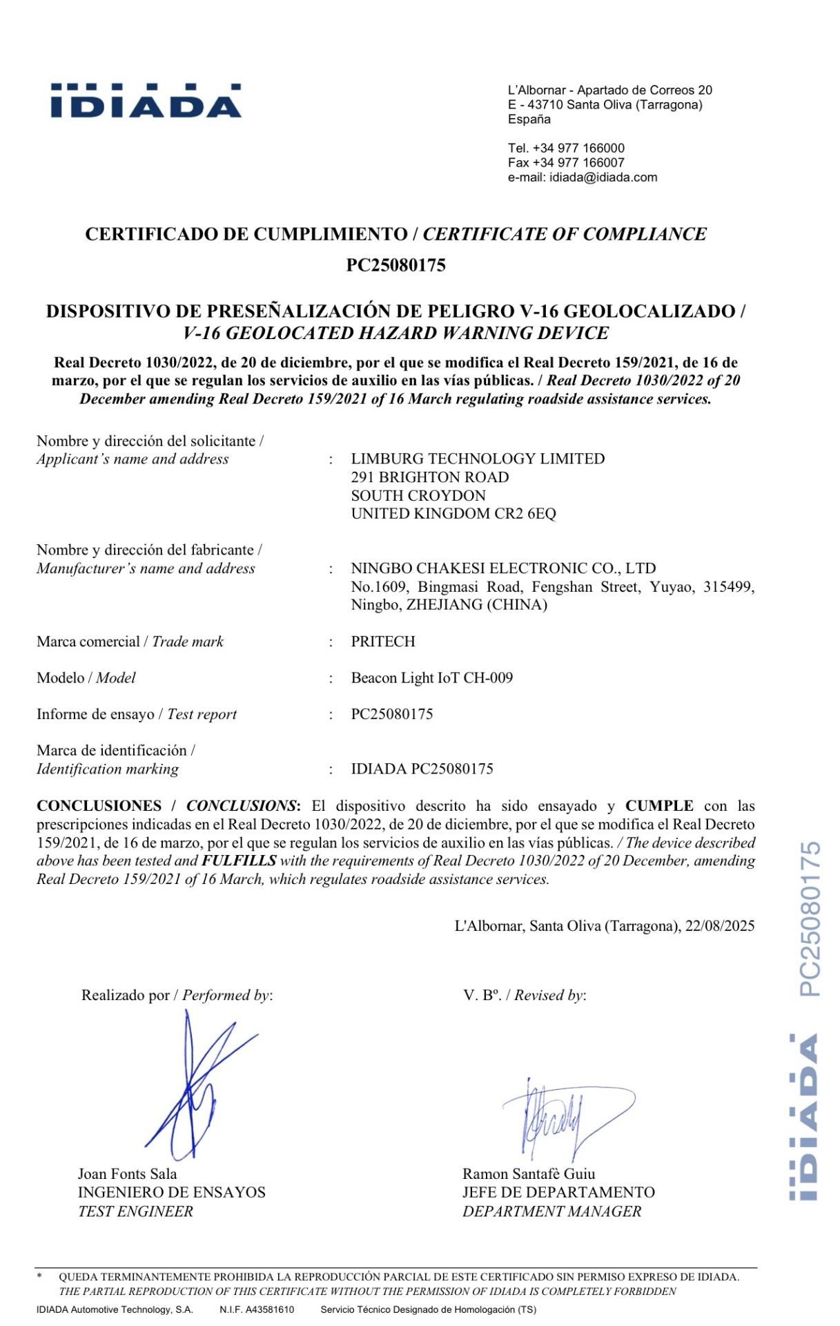 Cumple con la normativa oficial. Certificación IDIADA (PC25040153) grabada en la base. Totalmente legal y válida para su uso obligatorio a partir de 2026.