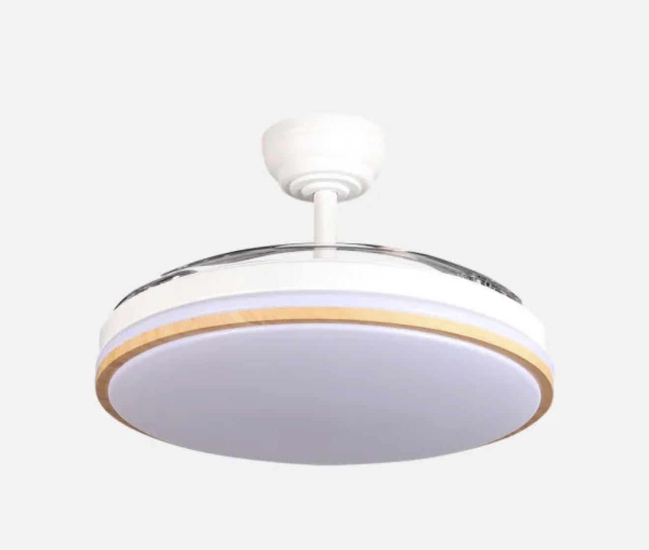 Ventilador DC de la serie RELAMPAGO realizado en metal, policarbonato y ABS, en color BLANCO Y HAYA con tres aspas DESPLEGABLES de ABS transparente muy resistentes. Diseño muy moderno y original. Tiene seis velocidades ajustables. Tecnología LED integrada con una potencia de 60W, con 3 TEMPERATURAS SELECCIONABLES DE LUZ (3000-4300-6500K) y 6980 lúmenes. Control de aire verano o invierno. Su medida es de 36X48X48 centímetros con las aspas plegadas y de 36X107X107 centímetros con las aspas desplegadas. Mando a distancia INCLUIDO, REGULABLE EN INTENSIDAD, con MEMORIA DE COLOR incorporada y TEMPORIZADOR 2H y 4H. Modelo disponible en color blanco y en color blanco/haya para elegir el que mejor le venga con su decoración.
