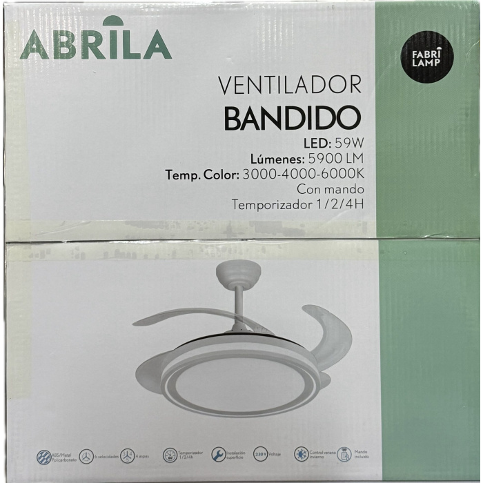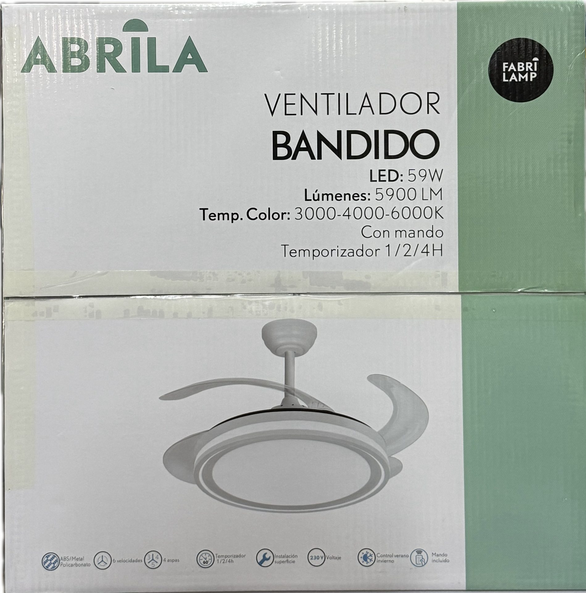 Ventilador DC de la serie BANDIDO realizado en metal, ABS y policarbonato en color BLANCO con cuatro aspas DESPLEGABLES transparente muy resistentes. Tiene seis velocidades ajustables. Tecnología LED integrada con una potencia de 59W, con 3 TEMPERATURAS SELECCIONABLES DE LUZ (3500-4000-6500K) y 5900 lúmenes. Control de aire verano o invierno. Su medida es de 35,5/45,5X48 centímetros con las aspas plegadas y de 35,5/45,5X107 centímetros con las aspas desplegadas. Incluye dos tijas de 10 y 20 centímetros, para colocar a distintas alturas. Mando a distancia INCLUIDO y TEMPORIZADOR 1/2/4 H.